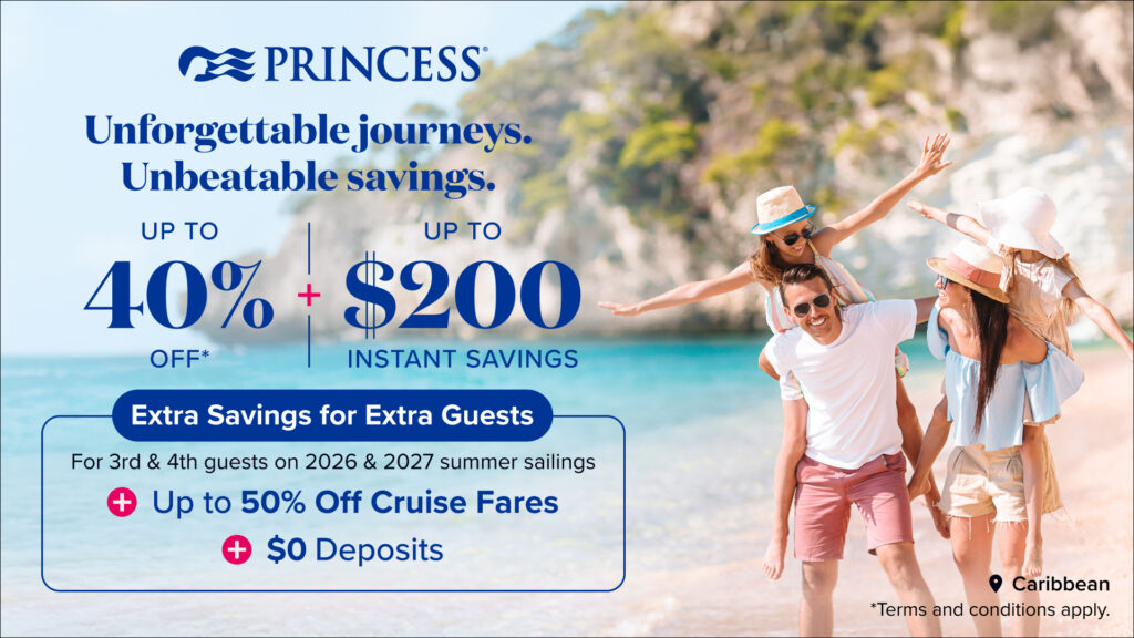 Introducing 100+ highly curated voyages specializing in one of six categories: CULTURE, EARTH & SKY, EXPLORE, MARVEL, WILD, WANDERLUST. These journeys offer unparalleled, immersive adventures, designed to pique your interests. Each of the cruises provide both the time and space for you to relax, while experiencing the finest the earth and humankind have to offer. The Princess Sail More, Save More event rewards you for going the distance. For a limited-time, the longer you sail, the more you save, with special discounts and up to $1,800 in Shore Excursion credit. This offer won’t last, so book your excursions soon! Offer valid through November 11, 2025.