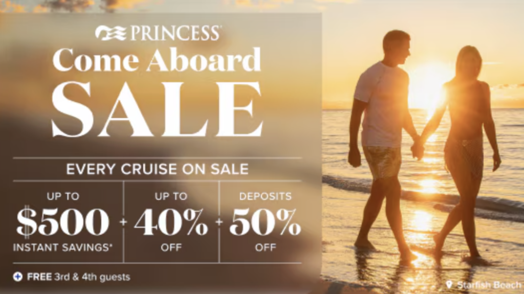The Come Aboard SALE is here and EVERY cruise is on SALE  with up to 40% off, up to $500 instant savings, 50% Off deposits and FREE 3rd & 4th guests (on select sailings). Chase the sun in the Caribbean, navigate the glaciers of Alaska or discover the charm of European towns. Book by February 16, 2026. Reach out to your favorite Dimensions in Travel advisor to book.
